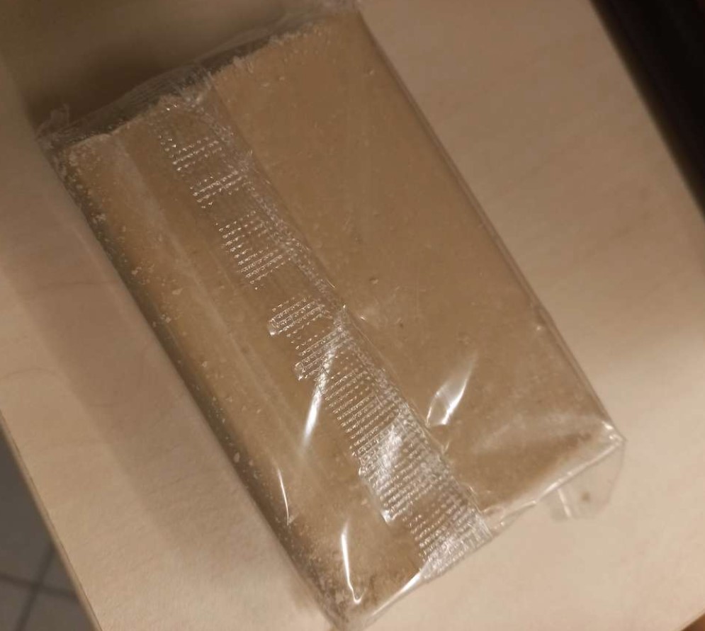 Куски прямоугольной формы, цвет от светло-коричневого до темно-коричневого, имеет специфический мыльных запах.