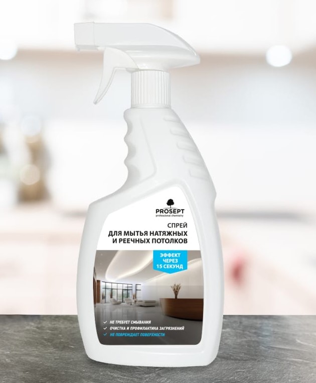 Universal Delicate - средство для очищения и предотвращения активного загрязнения натяжных и реечных потолков. Состав эффективно борется со следами жирового и мыльного налета, табака и насекомых, а также очищает от пыли, грязи и других бытовых загрязнений. Подходит для мытья натяжных ПВХ потолков с глянцевым, матовым и сатиновым полотном, покрытий с фотопечатью, а также реечных и подвесных потолков из алюминия, стали, дерева, ПВХ и других влагостойких поверхностей. Не требует смывания.
